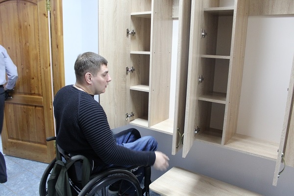 Александр подъезжает на коляске к шкафчику, без труда его открывает. Шкаф сделан так, чтобы дверцы не мешали ногам и коляске, - все продумано для человека. До мелочей.